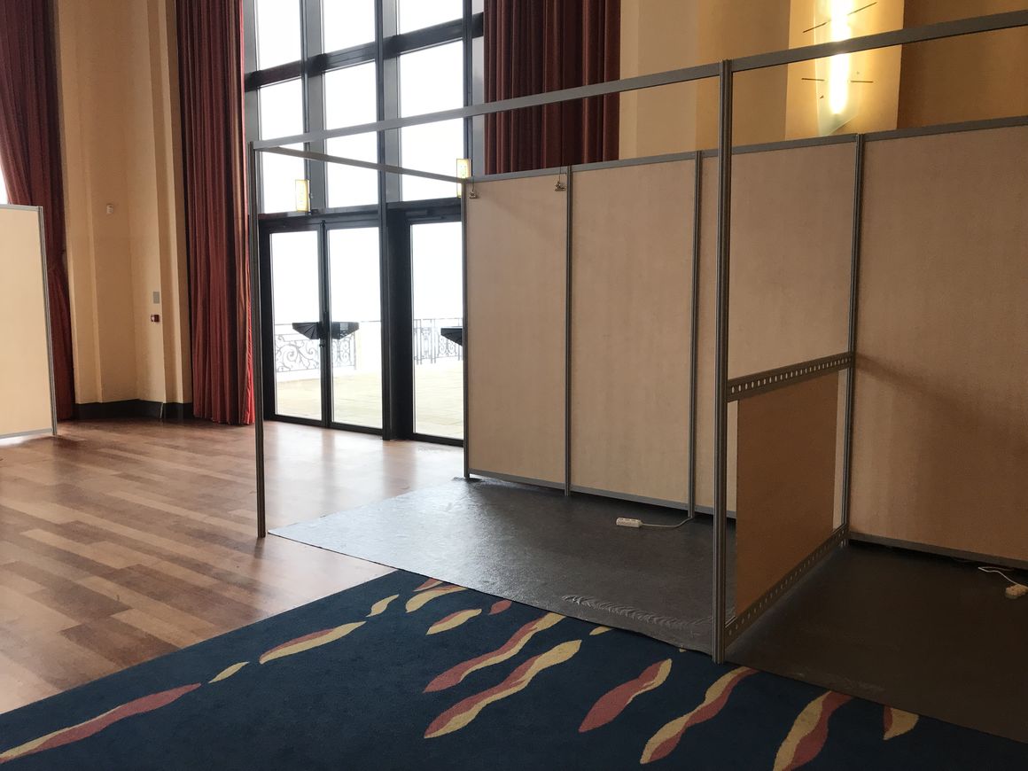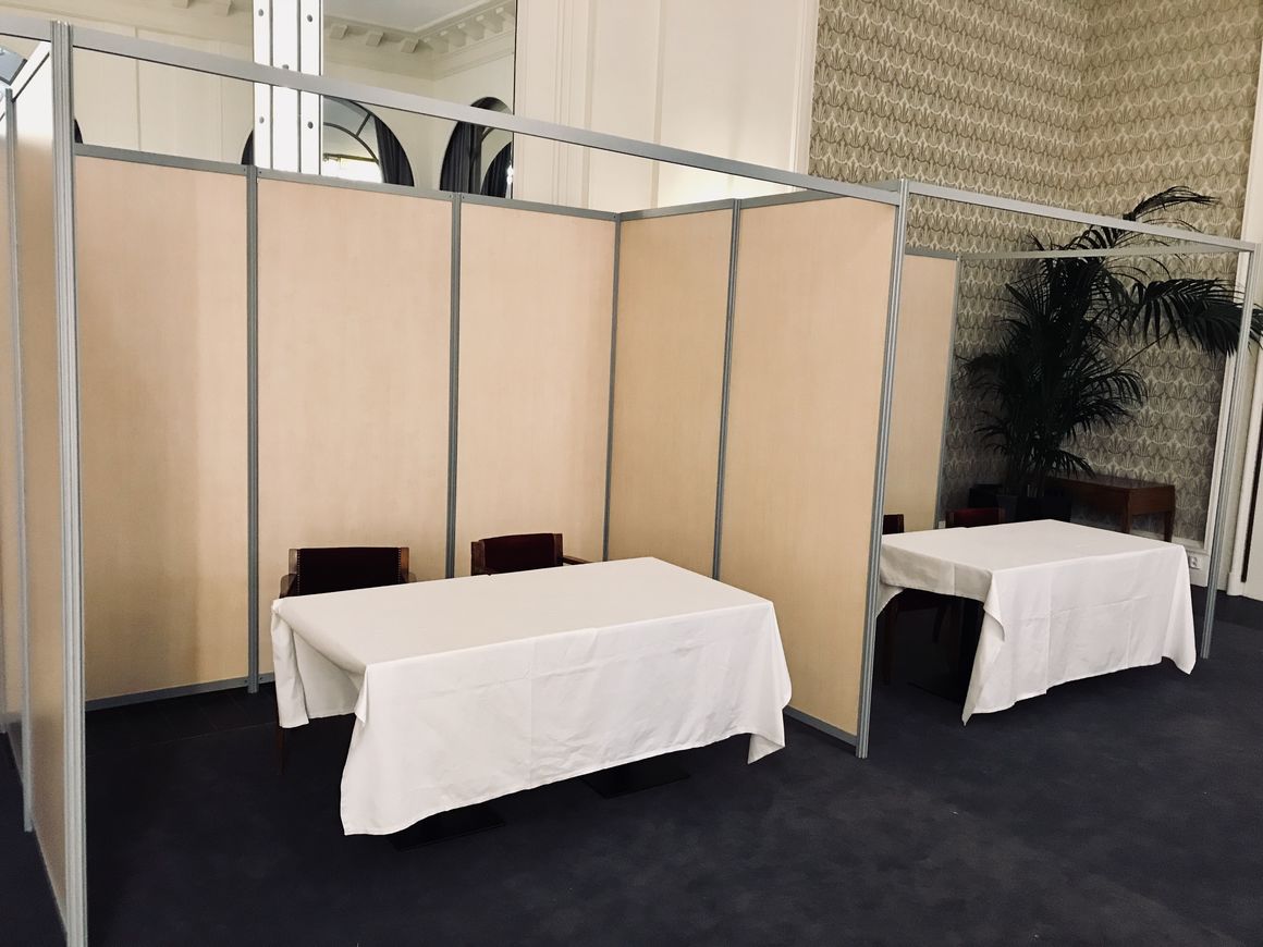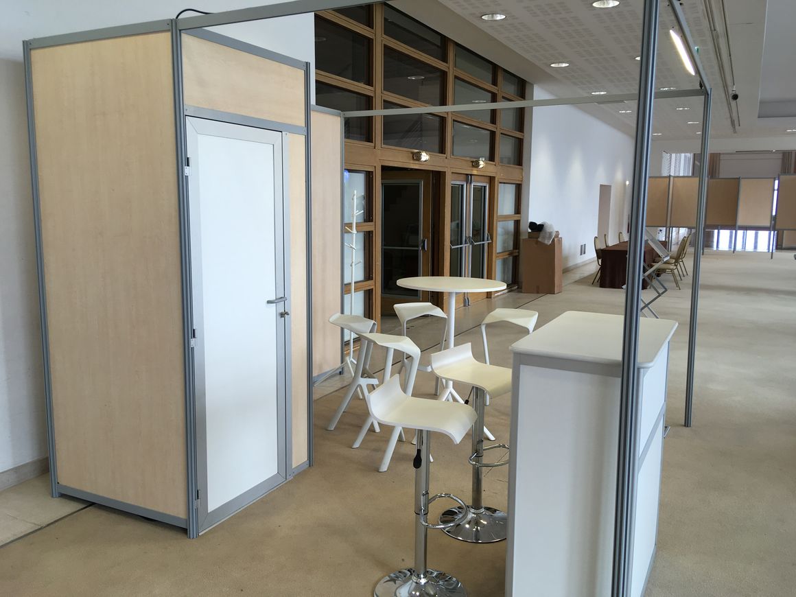 Stand en cloisons blanches ou ajourées Création de box Panneaux poster Création de guichets / caisses Agencement de cloisons CP recouvertes de coton gratté Accrochage et agencement d'exposition