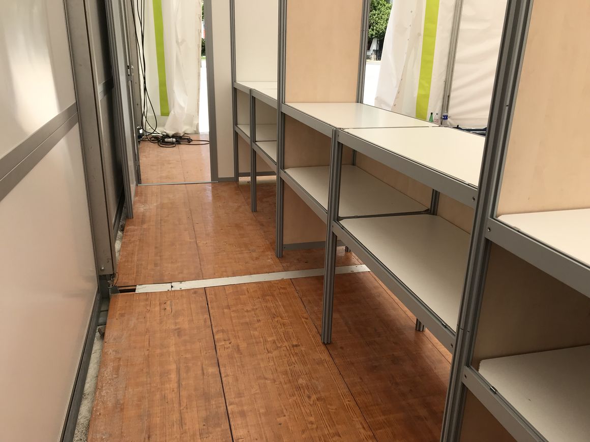 Stand avec cloisons en érable clair ou blanches Stand en cloisons blanches ou ajourées Création de box Panneaux poster Agencement de cloisons CP recouvertes de coton gratté Accrochage et agencement d'exposition