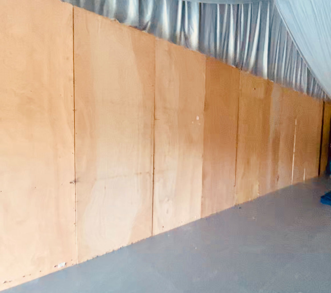 Agencement de cloisons CP recouvertes de coton gratté